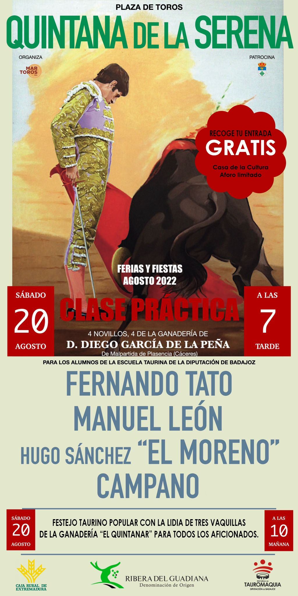 Tras dos años de pandemia, una de los eventos más esperado por muchos quintanenses regresa en la feria y fiestas de 2022. Se trata de una clase práctica con cuatro novillos de la ganadería de Diego García de la Peña.